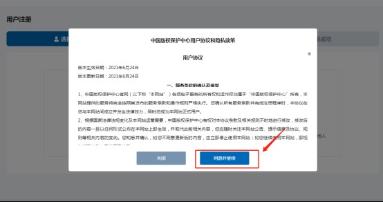 打开中国版权保护中心官网https://www.ccopyright.com.cn,点击右上角注册《注册》按钮后显示用户协议,点击《同意并继续》按钮,进入下一步:
