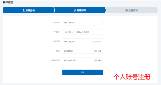 选择《个人》会显示如下界面,输入用户名、手机号、手机验证码、密码、确认密码后,点击《提交》按钮: