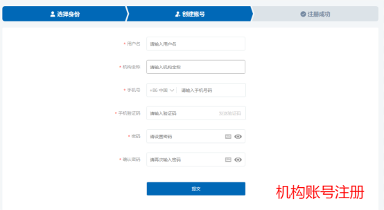 选择《机构》会显示如下界面,输入用户名、机构全称、手机号、手机验证码、密码、确认密码后,点击《提交》按钮: