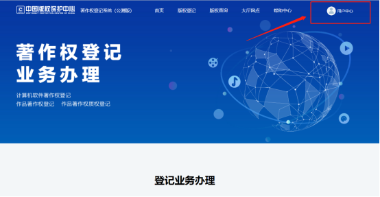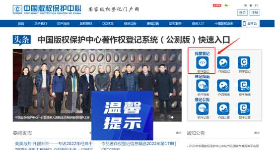账号申请成功后返回版权局官网首页,点击《我要登记》的《软件登记》: