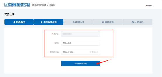 选择身份后,完善账户信息,输入用户名、邮箱、邮箱验证码后,点击《提交并继续实名》按钮: