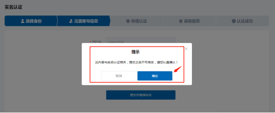 之后会提示“此内容与实名认证相关,提交之后不可修改,请您认真确认!”点击《确定》按钮后进入下一步: