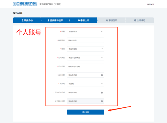之后申请认证,输入《个人》或《机构》的详细信息后(这里以个人账号为例),点击《提交审核》按钮: